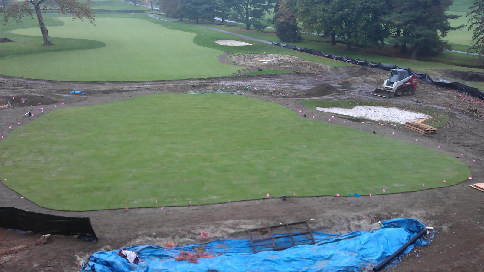 Yesterday was a success for us. The contractors were able to finish sodding 18 green completely before the rain came in last night. The sod came from our nursery by 5 green. I am hoping that it will "knit in" and start to grow roots into the soil within the next 14 days. Weather will be the biggest factor. Unfortunately we can't move to draining the bunkers until tomorrow. The rain has turned the soil into mud.
